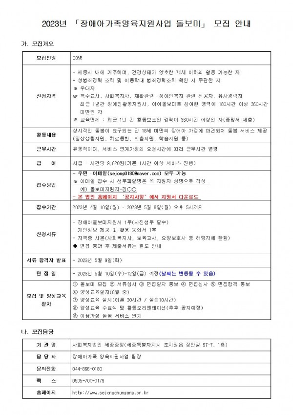 2023년 「장애아가족양육지원사업 돌보미」 모집 안내 2차