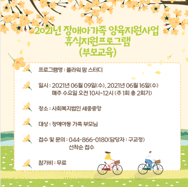 2021년 장애아가족양육지원사업 휴식지원프로그램(부모교육) 안내 페이지 정보 작성자 관리자 작성일21-05-14 14:26 조회2,676회 댓글0건 관련링크 이전글 다음글 목록 본문 댓글목록 등록된 댓글이 없습니다. 이전글 다음글 목록